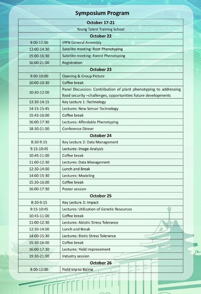 大會(huì)將以“可持續(xù)農(nóng)業(yè)中的表型:挑戰(zhàn)與展望(Phenotyping for Sustainable Agriculture: Challenges and Perspectives)”為主題,圍繞植物表型測量技術(shù)、大數(shù)據(jù)分析及應(yīng)用、高通量植物表型平臺(tái)應(yīng)用三個(gè)主題,就植物表型領(lǐng)域前沿理論、技術(shù)、方案等進(jìn)行交流,與全球頂尖學(xué)者共同分享研究經(jīng)驗(yàn)。此外,10月17-21日,大會(huì)安排了青年學(xué)者培訓(xùn)班;10月26日,大會(huì)將組織表型平臺(tái)技術(shù)參觀。