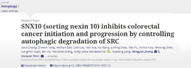 2019年6月17日,國(guó)際學(xué)術(shù)期刊Autophagy在線發(fā)表了復(fù)旦大學(xué)藥學(xué)院沈曉燕教授與中國(guó)科學(xué)院上海藥物研究所鄭明月研究員合作的最新科研成果“SNX10 (sorting nexin 10) inhibits colorectal cancer initiation and progression by controlling autophagic degradation of SRC”。