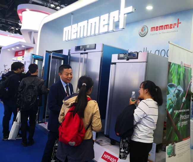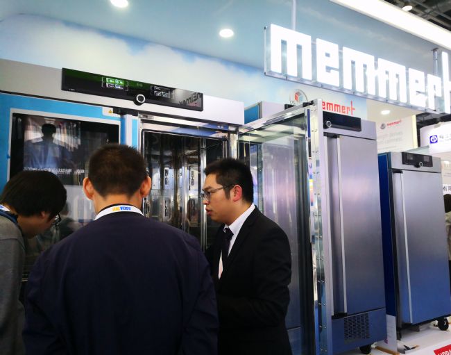 Memmert展臺(tái)新穎的布局與多樣化的樣機(jī)展示吸引了來自世界各地的參觀者,現(xiàn)場互動(dòng)熱烈,展區(qū)一度擁擠異常。參觀觀眾紛紛被箱體驚艷外觀吸引,上前咨詢,產(chǎn)品專家們就參觀嘉賓感興趣的技術(shù)細(xì)節(jié)、設(shè)備運(yùn)行穩(wěn)定性等進(jìn)行了專業(yè)耐心地講解,并依托展區(qū)的樣機(jī)進(jìn)行展示,并做了個(gè)性化演示測試。