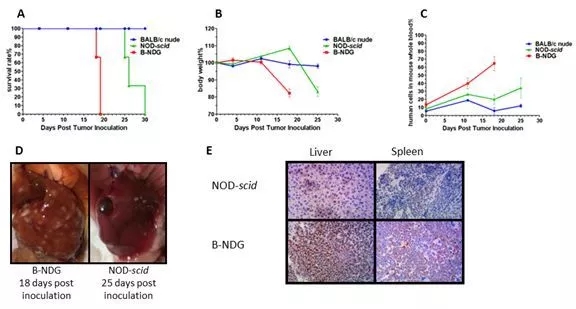 對B-NDG、NOD-scid、BALB/c Nude小鼠通過尾靜脈注射相同數(shù)量(5 × 105)的Raji細(xì)胞,后在不同的時(shí)間點(diǎn)記錄并分析小鼠的如下各種指標(biāo)。