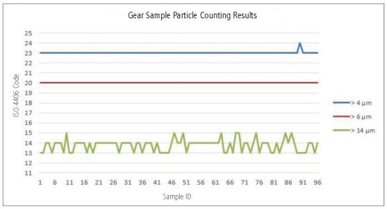圖2. 齒輪油樣的顆粒計(jì)數(shù)分析穩(wěn)定性,其中,粒徑大于4 μm、6 μm和14 μm的顆粒結(jié)果均在+/- 1 ISO代碼范圍內(nèi)