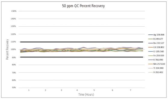 圖3. 576份在用油樣的整個(gè)8小時(shí)分析過程中,50 ppm QC穩(wěn)定性