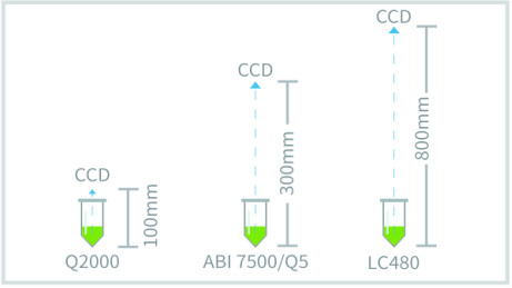 設(shè)計(jì)精巧,審美在線是這款Q2000C首先帶給我們的印象,更令人叫絕的是這款定量PCR系統(tǒng)采用SSLP短光程靜態(tài)熒光CCD成像技術(shù),該技術(shù)為朗基科儀的研發(fā)團(tuán)隊(duì)創(chuàng)新設(shè)計(jì),不與市場上同類產(chǎn)品雷同。短光程使熒光信號更穩(wěn)定,靈敏度更高(見圖1),也將儀器體積縮小到同類產(chǎn)品的一半左右。靜態(tài)設(shè)計(jì),避免了光學(xué)部分因運(yùn)動產(chǎn)生發(fā)熱、磨損走偏等現(xiàn)象。非光纖技術(shù),亦避免了光纖堵孔或折斷。