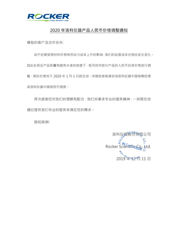 由于近期受原材料價(jià)格和勞動(dòng)力成本上升的影響,我們的運(yùn)營(yíng)成本也相應(yīng)發(fā)生變化。因此在保證產(chǎn)品質(zhì)量和服務(wù)水準(zhǔn)的前提下,我司將對(duì)部分產(chǎn)品的人民幣目錄價(jià)格進(jìn)行調(diào)整,新的價(jià)格將于2020年1月1日起生效。詳細(xì)信息敬請(qǐng)咨詢(xún)洛科儀器中國(guó)銷(xiāo)售經(jīng)理或洛科儀器中國(guó)授權(quán)代理商。
