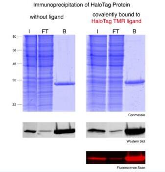 HaloTag®-Trap免疫沉淀Halo-Tag融合蛋白實驗: Input (I), non-bound (FT)和bound (B)分別通過SDS-PAGE, Western blot和熒光掃描分離。HaloTag-Trap能捕獲與配體共價結(jié)合的HaloTag融合物比如HaloTag TMR(右),以及游離的HaloTag融合蛋白(左)。這使得HaloTag配體預(yù)處理過的細胞中能下拉HaloTag融合蛋白,能成像,并使HaloTag體系能像GFP的表達、成像和純化一樣應(yīng)用廣泛。