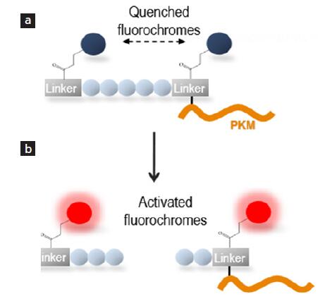 圖2. MMPSense探針激活原理圖。(a)與熒光團非常接近的信號淬滅探針,(b)蛋白酶切割將熒光團分開,從而能夠去淬滅并被激活。