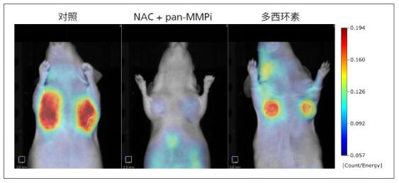 借助MMPSense熒光探針,可進行多時間點化療藥物治療下的腫瘤進展觀察。圖4顯示了未治療的對照乳腺脂肪墊腫瘤(對照),用N-乙酰半胱氨酸和MMP抑制劑(NAC + pan-MMPI)治療的動物以及用治療劑多西環(huán)素治療的動物。注射MMPSense 750 FAST探針后12小時,通過落射熒光成像觀察腫瘤進展。
