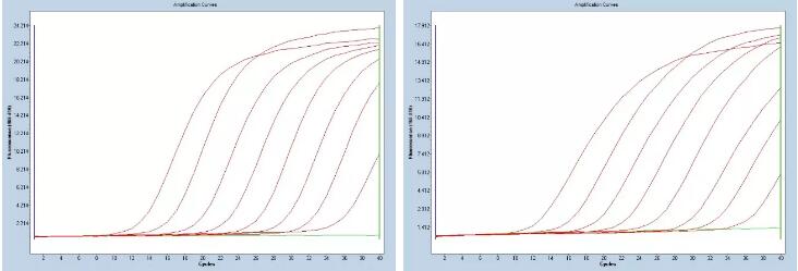 本試劑盒檢測線性范圍為2×109-20 copies/ul,檢測的兩個基因的最低檢測限均為20 copies/ul。