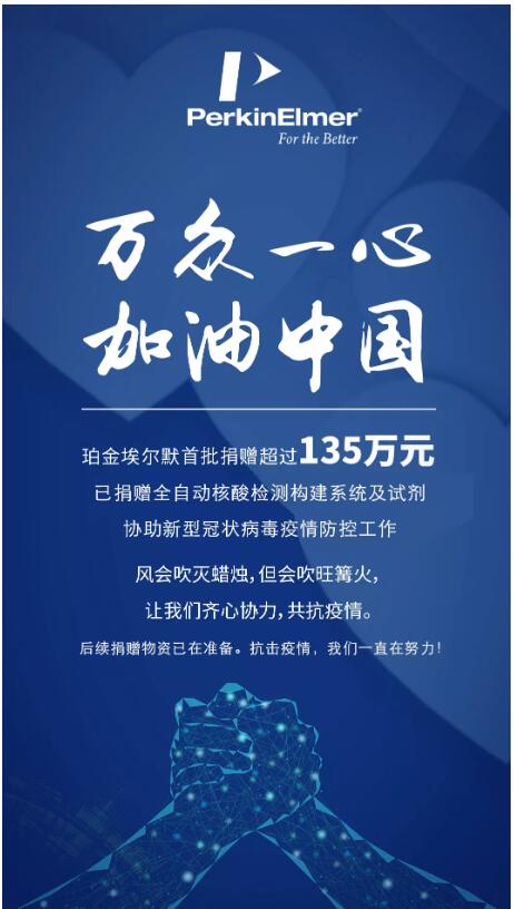 2020年1月29日,珀金埃爾默向中國(guó)人口福利基金會(huì)捐贈(zèng)價(jià)值135萬元的全自動(dòng)核酸檢測(cè)構(gòu)建系統(tǒng)和試劑,將用于支持黑龍江省疾病預(yù)防控制中心開展新型冠狀病毒感染的肺炎疫情防控工作,協(xié)助提高新型冠狀病毒檢測(cè)效率。