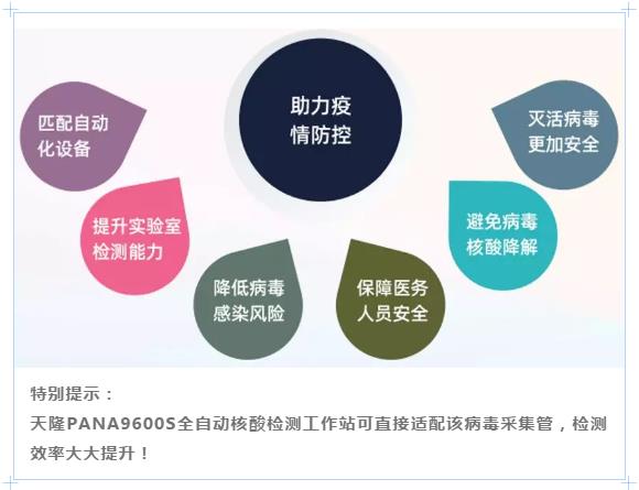 3、高效:滅活的病毒標(biāo)本可在常規(guī)PCR實驗室進行檢測,采集管可適配天隆自動化核酸提取系統(tǒng),提高了樣本的檢測效率。