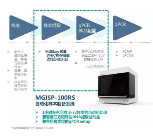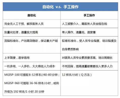 其中,MGISP-100自動化樣本制備系統(tǒng)可提取8-32樣本/40-80分鐘,每次可減少醫(yī)務(wù)人員約2個小時的手工操作的時間,適用于醫(yī)院等中小型研究實驗室。