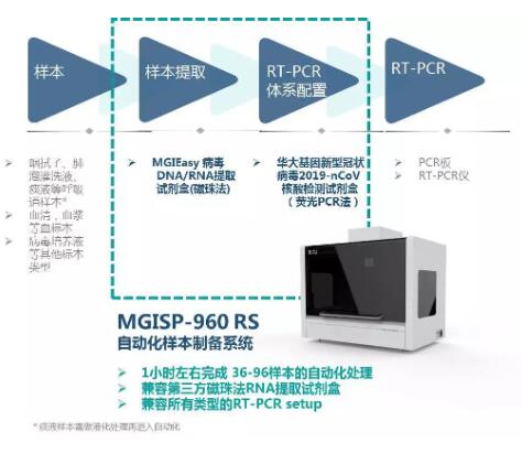 為實(shí)現(xiàn)病毒核酸自動(dòng)化提取,華大智造2019-nCoV檢測(cè)解決方案可提供MGISP-100及MGISP-960兩種自動(dòng)化樣本制備系統(tǒng),同時(shí)可配套病毒RNA的提取試劑和耗材。該方案在樣本處理過(guò)程中具有通量靈活、快速自動(dòng)、強(qiáng)大拓展性等特點(diǎn),上機(jī)后完全無(wú)人工干預(yù),可在1小時(shí)實(shí)現(xiàn)自動(dòng)化核酸提取,一站到位,安全防控。