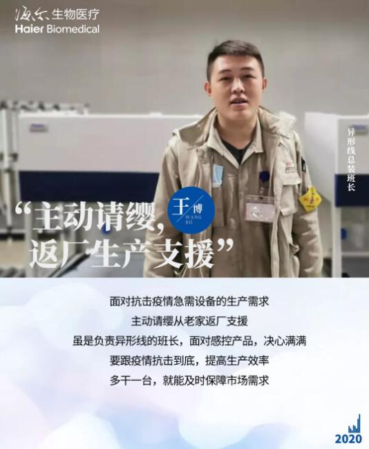 疫情就是命令,防控就是責任!面對抗擊疫情急需設備的生產(chǎn)需求,海爾生物醫(yī)療異性線總裝班長王博立刻取消了休假,主動請纓從老家返廠支援。