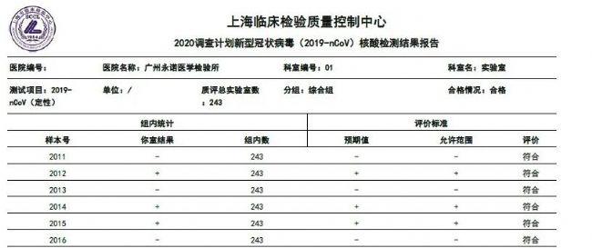 近日,廣州永諾醫(yī)檢所滿分通過由上海市臨床檢驗(yàn)中心(CNAS PT0025)、上海臨床檢驗(yàn)質(zhì)量控制中心組織的新型冠狀病毒(2019-nCoV)核酸檢測(cè)室間質(zhì)評(píng)。