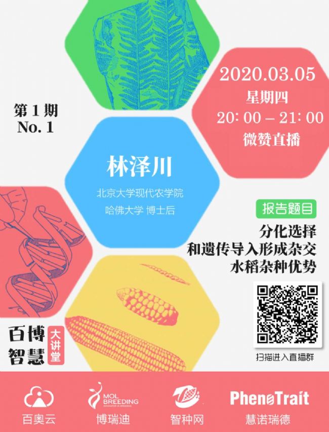 百博智慧大講堂第一期將邀請哈佛大學(xué)博士后,北京大學(xué)鄧興旺課題組畢業(yè)的林澤川博士,就他最新在《美國科學(xué)院院報》(PNAS)在線發(fā)表的“Divergent selection and genetic introgression shape the genome landscape of heterosis inhybrid rice”的研究論文(詳情見 北京大學(xué)鄧興旺/何航團(tuán)隊:雜交水稻雜種優(yōu)勢形成遺傳機(jī)制),揭示水稻雜種優(yōu)勢位點形成的機(jī)制,進(jìn)行全方位解讀。該研究從群體進(jìn)化的角度,追溯了雜種優(yōu)勢位點的遺傳起源,解析了育種家如何利用水稻多樣性構(gòu)建雜交親本的遺傳機(jī)制,為雜種優(yōu)勢組合親本的構(gòu)建提供了理論基礎(chǔ)。