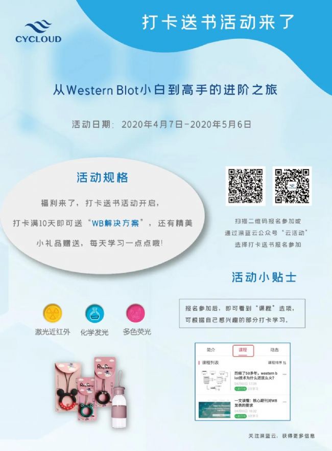 你想知道現(xiàn)在期刊雜志對(duì)WB數(shù)據(jù)提交的要求嗎?想知道熒光Western與化學(xué)發(fā)光的不同嗎?想知道如何進(jìn)行數(shù)據(jù)質(zhì)控嗎?想知道用什么內(nèi)參最合理嗎?想知道定量WB如何做嗎?想知道WB常見問題如何解決嗎?你想知道的問題都在這里,快來參加深藍(lán)云知識(shí)打卡,每一關(guān)都有您關(guān)注的重點(diǎn),既能得到WB應(yīng)用指南,還有小禮品贈(zèng)送哦。