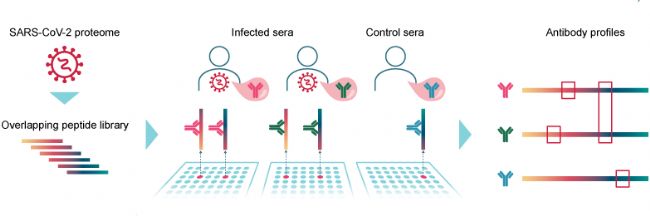 整個(gè)SARS-CoV-2病毒蛋白質(zhì)組被翻譯成包含重疊區(qū)域的肽段,并打印到載玻片芯片上。 患者血清在芯片上孵育,血清中的抗體與肽段上的表位結(jié)合。通過(guò)比較不同樣品的芯片掃描數(shù)據(jù),以監(jiān)測(cè)隨時(shí)間變化的B細(xì)胞免疫應(yīng)答或?yàn)轶w外診斷篩選疾病特異性的生物標(biāo)志物。