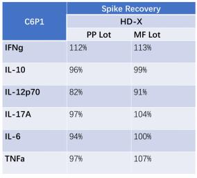 不同批次試劑盒檢測(cè)各細(xì)胞因子結(jié)果的Spike Recovery值均在80-120%