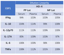 不同批次試劑盒檢測(cè)各細(xì)胞因子結(jié)果的稀釋線性值均在80-120%