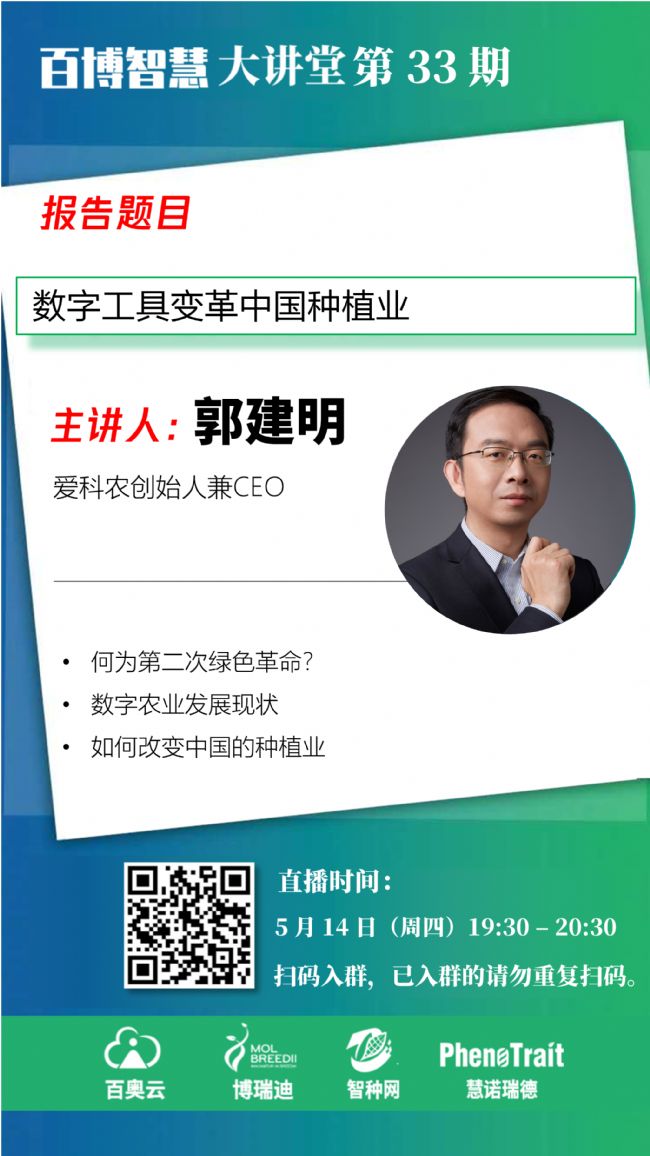 為幫助大家了解知識產(chǎn)權(quán)保護、育種研發(fā)服務(wù)、種質(zhì)資源托管、基因型分型、基因編輯、表型組學(xué)、人工智能和育種大數(shù)據(jù)等前沿技術(shù),同時也為同行們相互交流提供更多的機會,由百奧云、博瑞迪、智種網(wǎng)和慧諾瑞德等新銳力量秉持資源整合、平臺共享、匯聚眾智、創(chuàng)新引領(lǐng)的原則,聯(lián)合組織公益性線上學(xué)習(xí)平臺——百博智慧大講堂,邀請行業(yè)經(jīng)驗豐富的專家、老師進行線上交流,共同探討新形勢下種業(yè)發(fā)展思路,共同“破冰”。