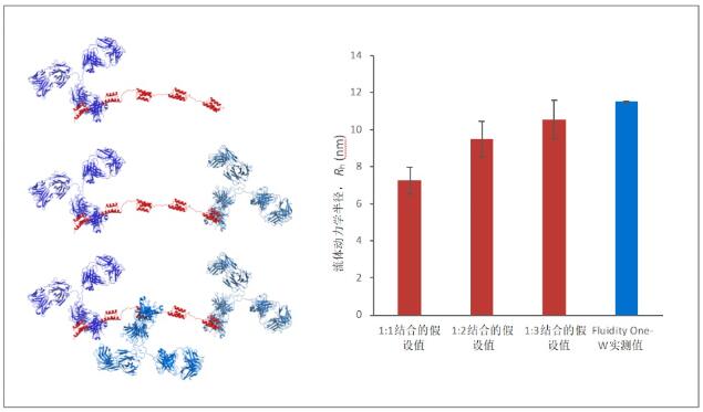 上圖的模型模擬了以1:1、1:2和1:3的比例結合的SpA-IgG復合物。紅色帶狀物代表SpA,藍色帶狀物代表IgG。用模型計算了三種比例結合物的 Rh 假設值(紅色條形)。將Fluidity One-W測得的 Rh平均值(藍色條形)與這些假設值做比較。紅色條形上添加了Rh預測值的10%作為誤差范圍,以表示模型中的最小不確定性?梢钥吹紽luidity One-W的測量值與1:3結合比例的SpA-IgG復合物的Rh 假設值相符。