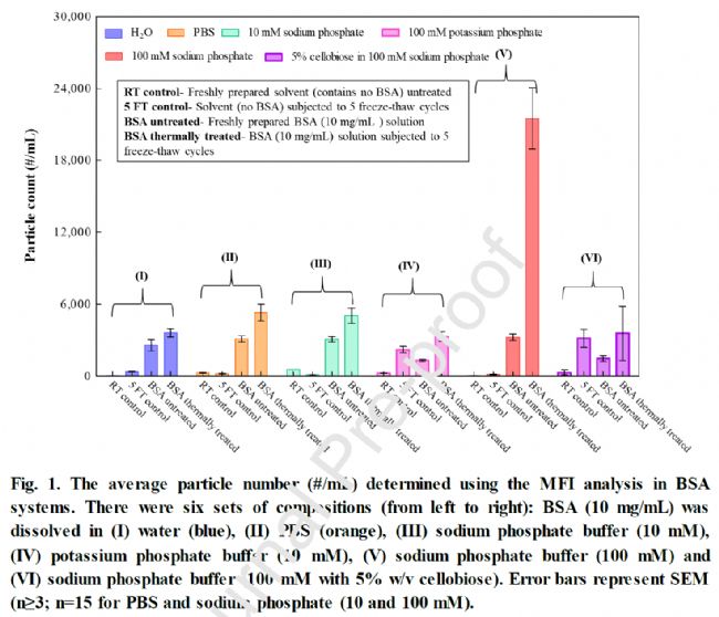 利用MFI檢測(cè)發(fā)現(xiàn),無(wú)論何種緩沖液,BSA(10mg/mL)在制備和立即分析時(shí)均顯示出最低的顆粒數(shù)。當(dāng)這些溶液經(jīng)受五個(gè)凍融循環(huán)時(shí),在許多系統(tǒng)中顆粒數(shù)量都有小幅增加。但凍融循環(huán)在磷酸鈉緩沖液(100mM)中導(dǎo)致的顆粒計(jì)數(shù)增加顯著。加入纖維二糖(纖維二糖(一種還原糖)被用作模型非結(jié)晶溶質(zhì),一種冷凍保護(hù)劑)后,在磷酸鈉緩沖液(100mM)中導(dǎo)致的顆粒數(shù)有明顯緩解。