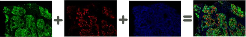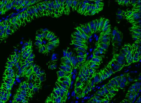 圖3.使用iFluor PSA 成像試劑盒對(duì)甲醛固定,石蠟包埋的人肺腺癌進(jìn)行順序免疫染色。 (1.)用兔抗EpCam抗體和帶有山羊抗兔IgG(#45205)的iFluor 488 PSA 成像試劑盒標(biāo)記EpCam,然后洗滌。 (2.)Pan-Keratin用小鼠抗Pan Keratin抗體和iFluor 555 帶有山羊抗小鼠IgG 的PSA 成像試劑盒(#45270)標(biāo)記。(3.)細(xì)胞核用DAPI(#17507)標(biāo)記。(4.)最終在共聚焦顯微鏡上采集圖像。 | |
