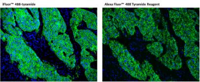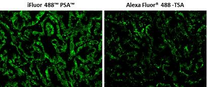 圖2.分別用iFluor 488 PSA和Alexa Fluor 488 TSA染色甲醛固定的石蠟包埋人肺腺癌陽性組織的染色結(jié)果圖。人肺腺癌陽性組織切片用兔抗EpCam抗體染色,然后用polyHRP標(biāo)記的山羊抗兔IgG二抗孵育,最后使用iFluor 488 PSA (Cat#45020)和Alexa Fluor 488 TSA分別染色。圖像顯示iFluor 488 PSA與Alexa Fluor 488 TSA相比提高了熒光IHC的靈敏度。 |
