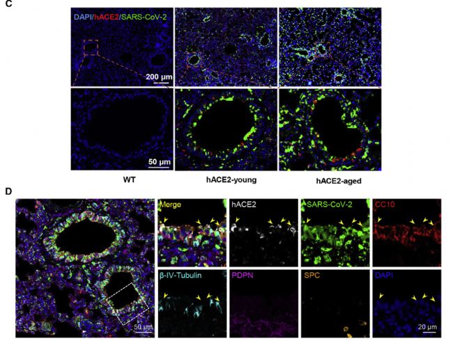 人血管緊張素轉(zhuǎn)化酶II(ACE2)已被確定為SARS-CoV-2的功能受體。 在這項(xiàng)研究中,我們使用CRISPR / Cas9敲入技術(shù)生成了表達(dá)人ACE2(hACE2)的小鼠模型。與野生型C57BL/6小鼠相比,青年和老年hACE2小鼠經(jīng)鼻感染后,在肺、氣管和腦中均能維持較高的病毒載量。盡管未觀察到死亡,但在感染SARS-CoV-2的老年hACE2小鼠中發(fā)現(xiàn)間質(zhì)性肺炎和細(xì)胞因子升高。有趣的是,已證明在胃內(nèi)接種SARS-CoV-2會導(dǎo)致生產(chǎn)性感染并導(dǎo)致hACE2小鼠發(fā)生肺部病理變化。該動物模型為研究SARS-CoV-2的傳播和發(fā)病機(jī)制,評價COVID-19疫苗和治療方法提供了有用的工具。