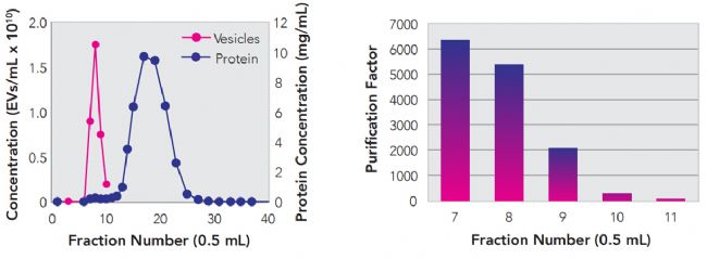 qEV是一種根據(jù)尺寸排阻原理SEC (Size exclusion Chromatography)設(shè)計的一體化外泌體分離/純化技術(shù)。qEV有效地避免了傳統(tǒng)離心方法在分離外泌體時,由于超高離心力與蔗糖溶液高粘性造成的高豐度蛋白包裹及囊泡聚集的污染,也有效避免了傳統(tǒng)方法對于外泌體的膜結(jié)構(gòu)的損傷,全面保留了外泌體的生物活性,可用于外泌體功能實驗。