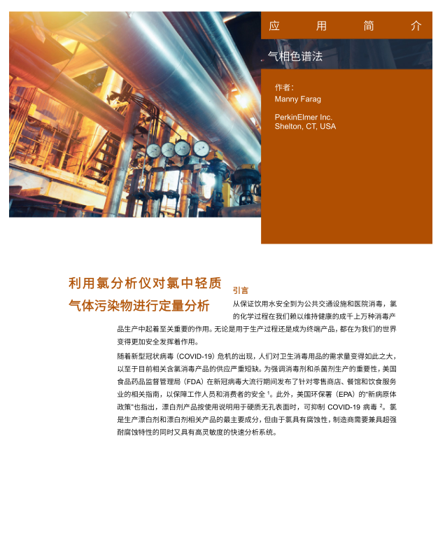 珀金埃爾默推出氯氣分析儀,是市場上唯一一套能對干、濕氯氣中的氫氣、氧氣、甲烷、一氧化碳、二氧化碳等輕質(zhì)雜質(zhì)氣體進行準確靈敏的檢測,保障生產(chǎn)安全和質(zhì)量控制。