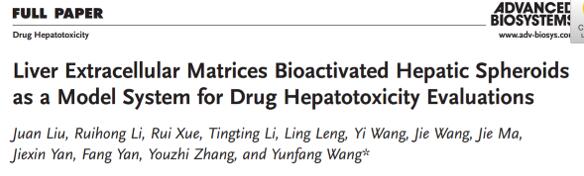 2018年,王韞芳課題組在新刊Advanced Biosystems雜志上發(fā)表封面文章,研究展示一種新型的藥物性肝損傷研究模型——LBS微肝球模型(Liver biomatrices scaffolds, LBSs)。該模型在HepaRG細胞的基礎上引入天然脫細胞肝臟支架,可進行肝細胞的長期3D培養(yǎng)。在LBS提供的肝組織特異微環(huán)境下,新模型具有更高的生理相關性和毒理預測敏感度。
