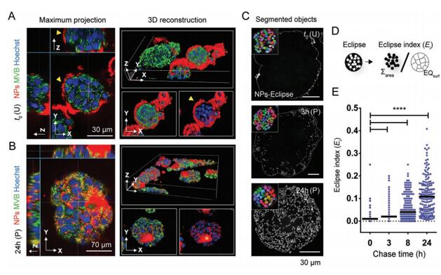 接下來,作者通過Harmony軟件對層切掃描圖片進行重構分析,獲取最大亮度投影和3D重構視圖,在此基礎上定量測量球狀體中NP吸收和滲透。