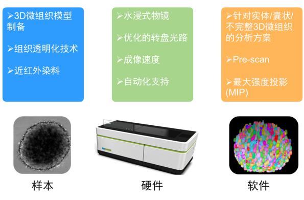 針對3D微組織樣品,使用傳統(tǒng)的冰凍切片染色成像或直接使用共聚焦顯微鏡進行成像都有很多挑戰(zhàn):冰凍切片成像無法獲得立體樣品的全部信息,特別是Z軸的細胞位置信息;共聚焦顯微鏡有較高的光毒性和光漂白,不能對立體樣品反復多層的成像,成像的層數(shù)有很大限制;此外,這兩種拍攝方法獲取的大量圖片還需借助其他分析軟件對其數(shù)據(jù)進行分析和統(tǒng)計,分析通量很低;最重要的是,這兩種方法掃描速度都很慢,通量很低,一個3D微組織的掃描分析時間長達幾個小時,極大的限制了3D微組織研究的開展。