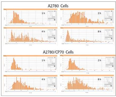 兩株卵巢癌細胞系A2780( 順鉑敏感型)和A2780/CP70 (順鉑耐藥型)隨時間變化順鉑攝入量