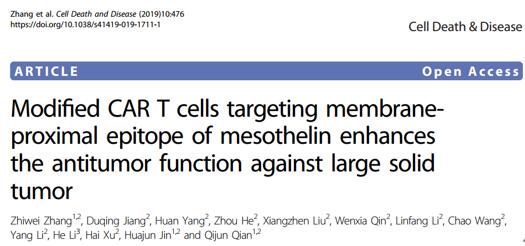 2019年6月17日,Cell Death and Disease雜志在線發(fā)表了錢其軍研究組的研究成果Modified CAR T cells targeting membrane proximal epitope of mesothelin enhances the antitumor function against large solid tumor。該工作致力于優(yōu)化腫瘤CAR T免疫療法。