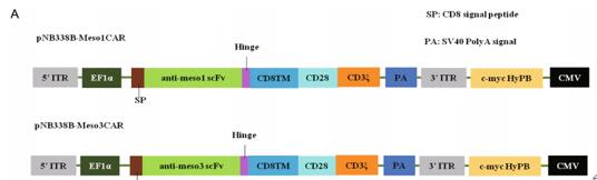 MSLN(Mesothelin,間皮素)是嵌合抗原受體(CAR)T治療的誘人抗原,MSLN中的表位選擇至關重要。在這項研究中,作者使用修飾的piggyBac轉座子構建了兩種針對MSLN的I區(qū)(meso1 CAR,也稱為膜遠端區(qū)域)或MSLN的III區(qū)(meso3 CAR,也稱為膜近端區(qū)域)的兩種類型的CAR系統(tǒng)。其中,meso3 CAR T細胞在激活后表達更高水平的CD107α,并在體外針對表達多種MSLN的癌細胞產(chǎn)生更高水平的白介素2,TNF-α和IFN-γ。