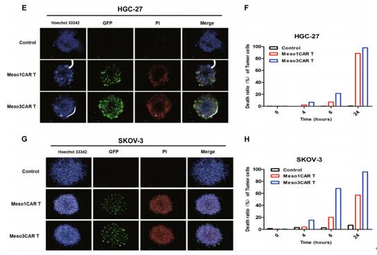 后續(xù)的研究中,作者借助PerkinElmer Xenogen IVIS成像系統(tǒng),在胃癌NSG小鼠模型中進一步進行驗證,同樣證明與meso1 CAR T細胞相比,meso3 CAR T細胞介導的抗腫瘤反應更強。我們進一步確定meso3 CAR T細胞可以有效地抑制體內大卵巢腫瘤的生長。