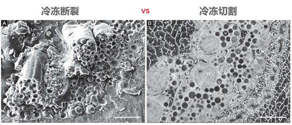 報告中對各種冷凍掃描電鏡及冷凍聚焦離子束掃描電鏡制樣流程做了詳細介紹,并且對冷凍斷裂與冷凍切割的差別做了具體舉例說明: