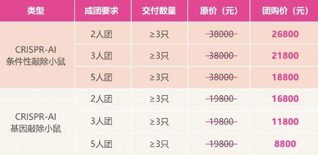 CRISPR-AI條件性敲除小鼠、基因敲除小鼠,同一基因2人拼單即可成團(tuán),原價(jià)1.98萬基因敲除小鼠,拼單低至8800元,原價(jià)3.8萬條件性敲除小鼠,拼單低至1.88萬!快來掃碼或點(diǎn)擊閱讀原文參與拼單吧!