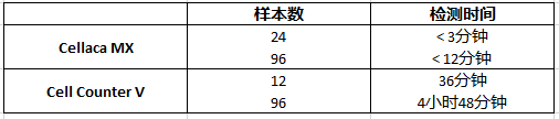 以目前實(shí)驗(yàn)室常見的檢測(cè)方法,計(jì)數(shù)100個(gè)左右的細(xì)胞樣本需要4-5小時(shí)。過久的計(jì)數(shù)時(shí)間不僅會(huì)使細(xì)胞的狀態(tài)下降,也會(huì)限制檢測(cè)通量的上限,從而阻礙整個(gè)實(shí)驗(yàn)項(xiàng)目的進(jìn)程。Cellaca™ MX高通量細(xì)胞計(jì)數(shù)儀可在3分鐘內(nèi)完成24個(gè)樣本的計(jì)數(shù), 100個(gè)樣本的檢測(cè)不到12分鐘,在速度上與常見方法相比提升了10倍以上。因此,細(xì)胞計(jì)數(shù)再也不會(huì)因?yàn)楹臅r(shí)過長而成為工藝開發(fā)的掣肘,用戶可大幅度提升樣本的檢測(cè)通量,加速項(xiàng)目的推進(jìn)。