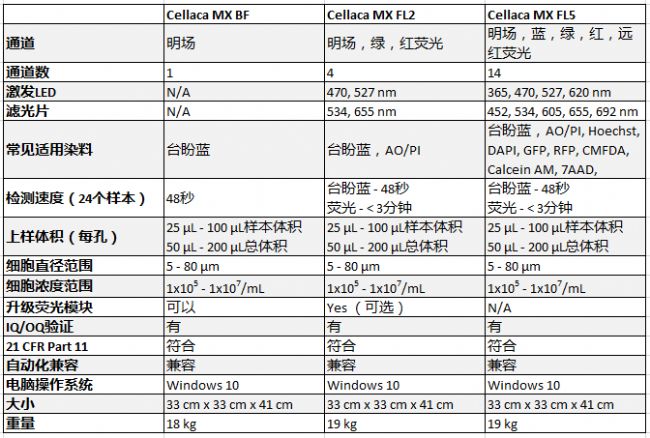 Cellaca™ MX根據(jù)配置的不同分為三個(gè)型號(hào) – BF, FL2和FL5。低配置的型號(hào)都可以升級(jí)為更高配置的型號(hào)。各型號(hào)的具體配置參數(shù)請(qǐng)見下表。