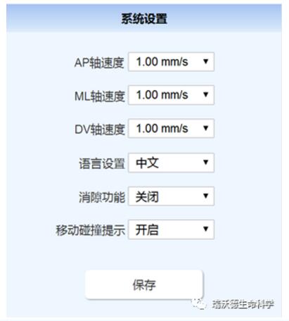 a、在PC端軟件界面三個(gè)軸對(duì)應(yīng)位置可分別輸入移動(dòng)速度進(jìn)行調(diào)節(jié),其中AP軸和ML軸4種移動(dòng)速度可選:2.00mm/s、1.00 mm/s、0.50 mm/s、0.20 mm/s;DV軸7種移動(dòng)速度可選2.00 mm/s 、1.00 mm/s、0.50 mm/s、0.20 mm/s 、0.01 mm/s、0.005 mm/s、0.001 mm/s。