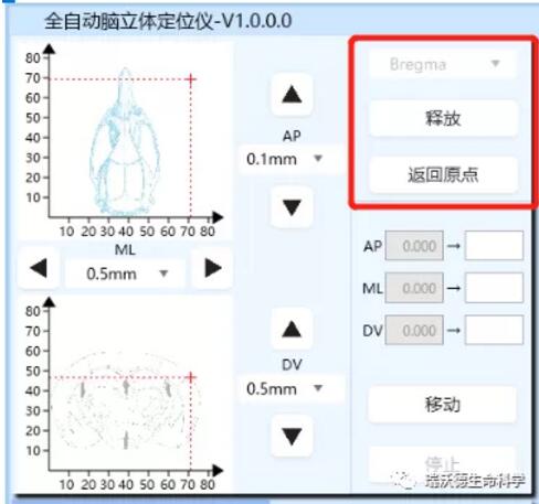 當(dāng)使用定位儀到達(dá)Bregma/Lambda位點(diǎn)時(shí)可以標(biāo)記,一鍵設(shè)定Bregma/Lambda位點(diǎn)。