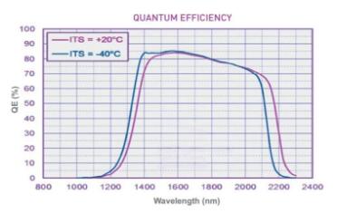 C-RED 2 ER不僅擴增了新的波段,在波段為1.4~2.0μm時其效率更是高于 70%,這也使得該相機可以輸出更高品質圖像。C-RED 2 ER制冷溫度可達-60℃,有效抑制了暗電流,在這個制冷溫度,滿幀情況下暗電流為60000e-。