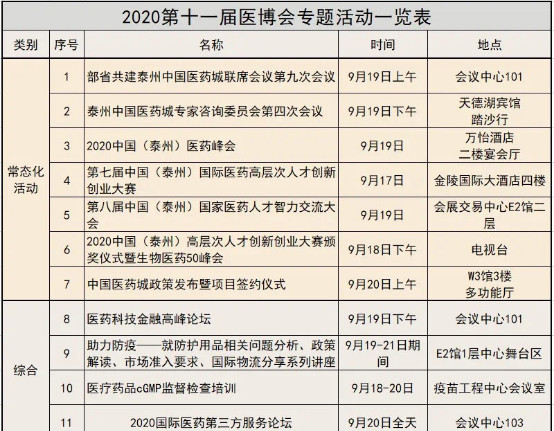 第十一屆中國(泰州)國際醫(yī)藥博覽會將于2020年9月19- 21日在中國醫(yī)藥城會展中心舉行,大會主題為:“疫情之下醫(yī)藥健康產(chǎn)業(yè)發(fā)展趨勢”。大會活動主要由開幕式、部省共建泰州醫(yī)藥高新區(qū)聯(lián)席會議第九次會議、展覽展示、專題論壇等四部分組成。期間將通過舉辦專業(yè)高峰會、專題高層次論壇、創(chuàng)新技術(shù)產(chǎn)品展示、項目對接合作等21場系列活動,搭建醫(yī)藥健康產(chǎn)業(yè)國際交流合作平臺。