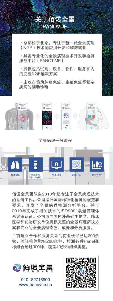 全景病理分析是一種創(chuàng)新型的多靶標(biāo)病理組織檢測技術(shù),以多靶點(diǎn)組織染色、全景數(shù)字病理掃描、定量病理分析技術(shù)為依托,可以在組織水平實(shí)現(xiàn)單細(xì)胞精度的多元統(tǒng)計分析,與單細(xì)胞測序技術(shù)、多色流式技術(shù)一道,成為細(xì)胞組學(xué)時代最重要的研究平臺。尤其在腫瘤免疫、生殖免疫、自身免疫等復(fù)雜疾病的臨床研究和輔助診斷開發(fā)領(lǐng)域,有著重要應(yīng)用價值。