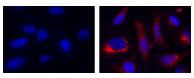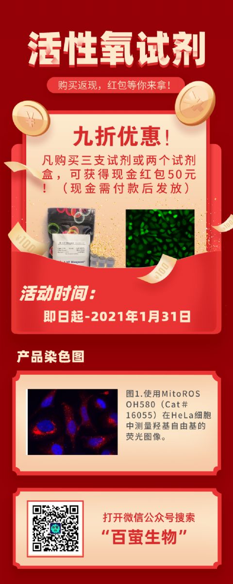 ![]() 圖1.使用MitoROS OH580(Cat#16055)在HeLa細(xì)胞中檢測羥基自由基的熒光圖像。將HeLa細(xì)胞與MitoROS OH580工作溶液在37°C下孵育1小時(shí),然后用HHBS洗滌一次。 Fenton反應(yīng):然后在37°C的1X HBSS緩沖液中,用10 µM CuCl2和100 µM H2O2處理細(xì)胞1小時(shí)。對照:HeLa細(xì)胞未經(jīng)處理即可保存在1X HBSS緩沖液中。用HHBS洗滌3次后,使用帶有TRITC濾光片組(紅色)的熒光顯微鏡測量HeLa細(xì)胞。細(xì)胞核用Hoechst 33342(Cat#17530,藍(lán)色)染色。 |