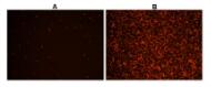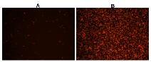 ![]() 圖2.在Costar黑色/透明底部96孔板中,用Cell Meter 熒光法細(xì)胞內(nèi)總ROS活性測定試劑盒染色的Hela細(xì)胞圖像。A:未經(jīng)處理的對照細(xì)胞。 B:細(xì)胞在染色前用100 µM氫過氧化叔丁基(TBHP)處理30分鐘。 |