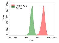 ![]() 圖3. 使用Cell Meter 細(xì)胞內(nèi)熒光過氧化氫檢測試劑盒(貨號:11506)檢測Jurkat細(xì)胞中的過氧化氫。將Jurkat細(xì)胞用OxiVision™Green過氧化物探針染色30分鐘,并在37°C下用100 µM過氧化氫處理90分鐘。用OxiVision™綠色過氧化物探針染色但未進(jìn)行過氧化氫處理的細(xì)胞用作對照。 |